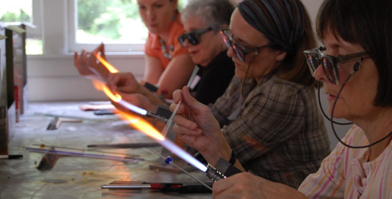 A community of enthusiastic artists and students call the Glass Studio at Brookfield Craft Center home. Lampwork, fused and stained glass classes are generally held as short Sampler Workshops or weekend workshops. Classes range from introductory to master-level, along with Lampwork Open Studio programs for independent practice. Lampwork beads are made using our 7 Minor torches fueled by oxy/propane and an annealing kiln. Small and large fused glass pieces are fired and slumped in “bathtub” and tabletop kilns.