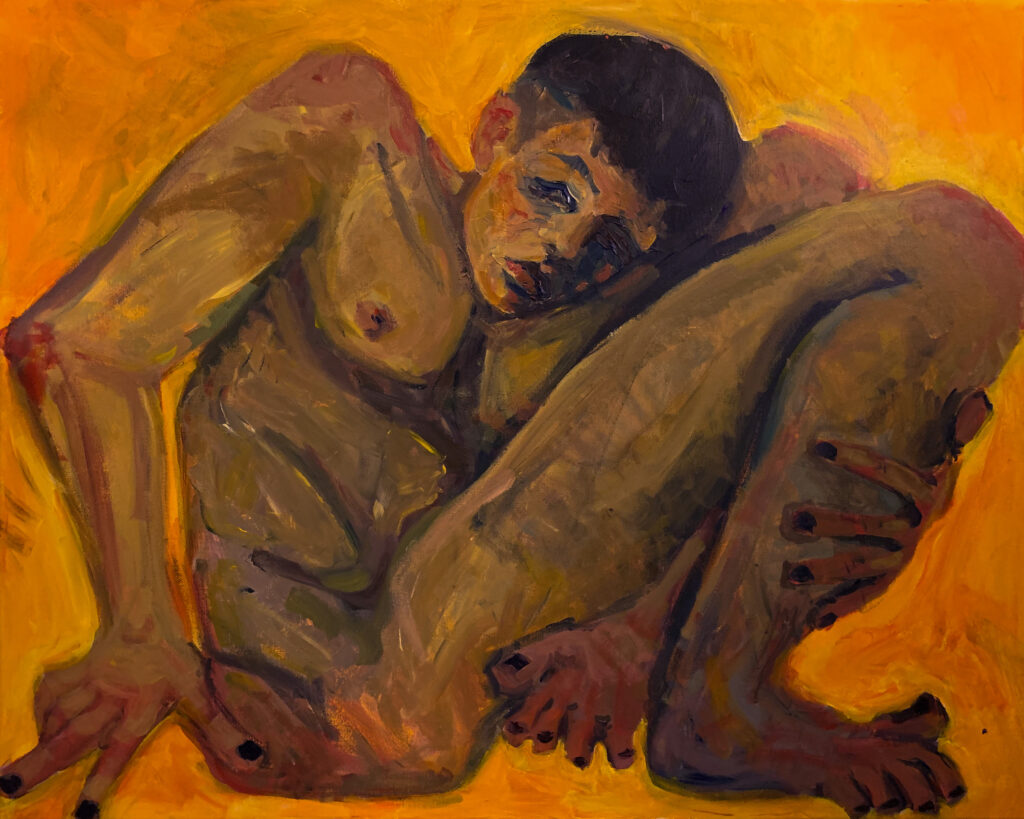 My paintings examine the impact of my experience as a queer sexual assault survivor on the relationship between my body, appearance, and sense of identity, engaging with themes of objectification, transformation, and survival by re imagining myself as an invincible, monstrous, ever-changing and many-limbed creature–too powerful and bizarre to harm or desire.