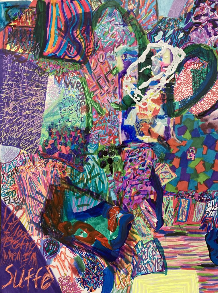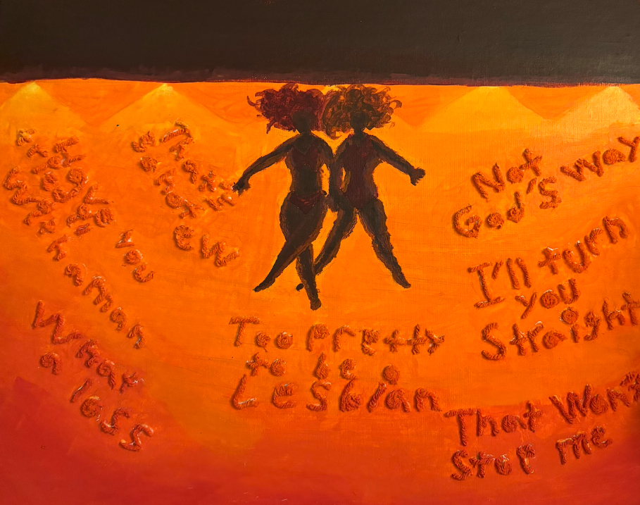 I dabble in all kinds of different mediums of art. I am focusing on digital art, but I have tons of physical pieces relating to the queer experience and the struggles in it. This piece represents attacks of hate crimes and violence on queer youth.