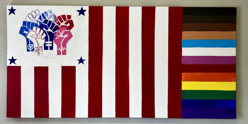 I made this piece as a response to the changing political climate. My love and respect for America needed to show through along with the pain, fear and uncertainty facing our nation which ends in a Pride flag, a grouping of the raised fists a symbol of resistance and solidarity, a gesture with a long history of representing protest and unity. Each fist holds a symbol of a group or democratic ideal that under threat.
