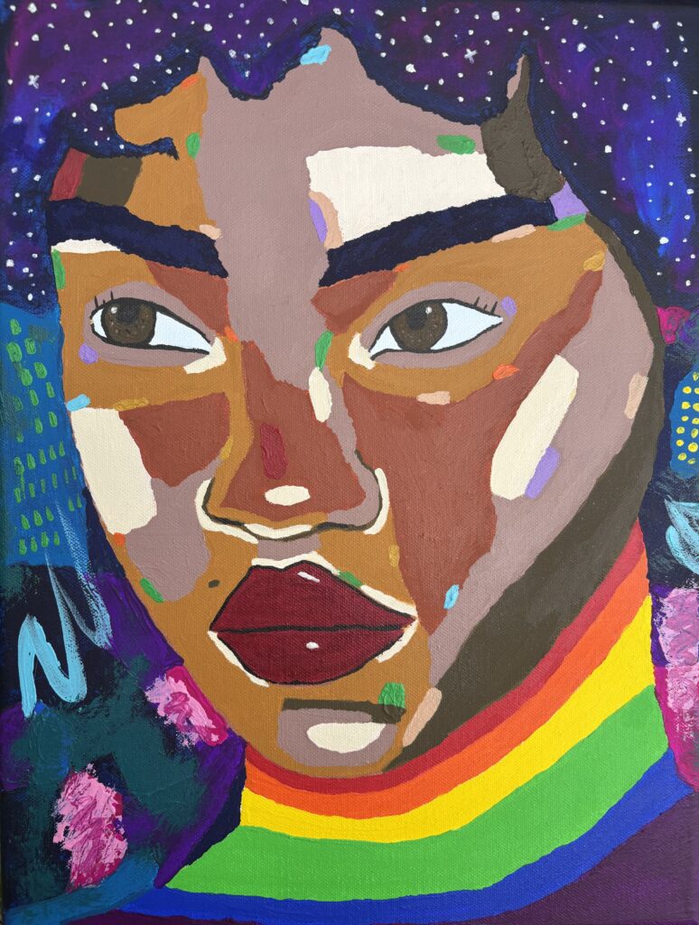 My work is deeply personal and political—I paint to process my experiences and reclaim my voice after years of silence and erasure. I’m especially drawn to bold color, symbolism, and emotion as tools for storytelling.