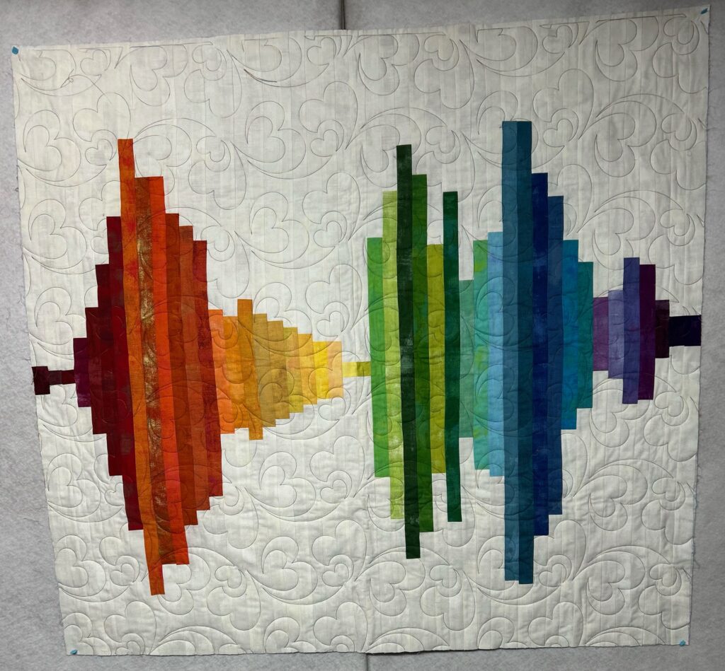 Uncertainty brings disharmony. Too many voices: loud, unbearable, soft, and quiet, from differing opinions and uncertain futures, creates noise and prevents people from listening, from loving. This quilt represents my love, harmonizing with many, that to learn to love ourselves and each other, even through uncertainty, involves listening, learning, and expressing ourselves with an open heart and mind, that love is love. Designed and created by Gerrit and quilted by Erin Byrne of Cotton Candy Fabrics.
