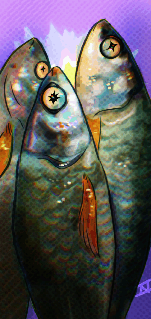 I have been exploring biblical male-on-male violence. I use color, form, and precise halftone layers to both queer the interaction between the figures and to highlight the entangling effect that violence between the two parties has on each other.