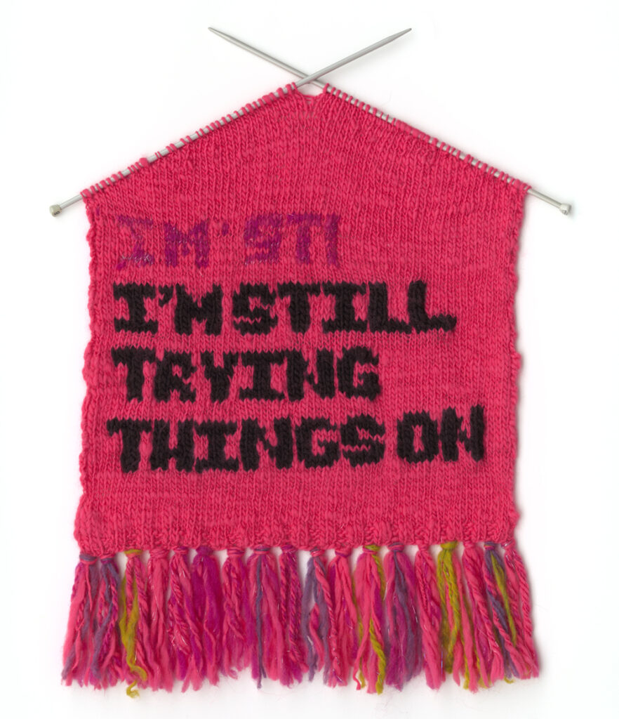 Changing Room Fiber Hand spun and commercial yarn, metallic fiber, knitting needles, ribbon, thread. 18″ x 23″ $350